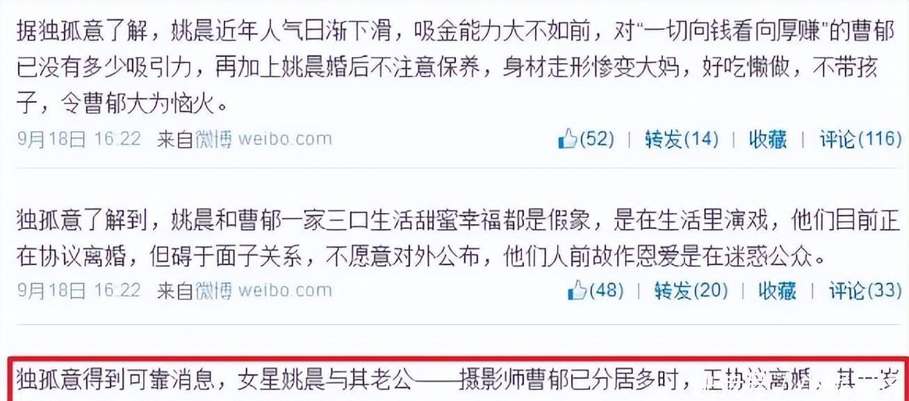 其实早在十二年前,婚变的传闻就闹得沸沸扬扬。那时候儿子刚出生没多久,就有博主直指男方跟异性纠缠不清,甚至传出了跟女方闺蜜暗通款曲的猛料。更有说法称,是因为姚晨婚后热度下降,男方觉得她没了魅力才变的心。虽然2016年他们又迎来了女儿,看似感情回暖,但回想那些蛛丝马迹,倒更像是为了挽回婚姻做的努力。后来曹郁被拍到跟神秘女子驾车出游,工作室虽解释是合伙人探班,可结合姚晨在节目里大谈“享受孤独”、“爱自己”,很难不让人多想。